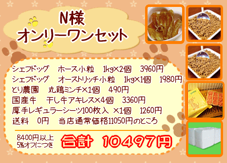 N様オンリーワンセット 定期購入価格: 10,497円レビュー評価: 0.0 レビュー数:0 ■シェフドッグ ホース小粒 1kg×2個 3960円■シェフドッグ オーストリッチ小粒 1kg×1個 1980円■とり農園 丸鶏ミンチ×1個 490円■国産牛 干し牛アキレス×4個 3360円■厚手レギュラーシーツ100枚入 ×1個 1260円送料無料(代引き料も無料)-------------------------------------------------合計当店通常価格11050円のところ、8400円以上5%オフにつき 10497円!!★さらに初回10%オフにつき、9392円 |