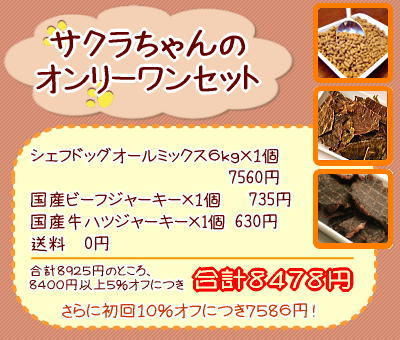 サクラちゃんのオンリーワンセット 定期購入価格: 8,478円レビュー評価: 5.0 レビュー数:1 ■シェフドッグ オールミックス 6kg(大粒)×1個 7560円■国産 ビーフジャーキー ×1個 735円■国産 牛ハツジャーキー ×1個 630円送料 0円------------------------------------------------合計8925円のところ、8400円以上5%オフにつき8478円!(さらに初回10%オフにつき7586円) |