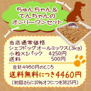 ちゅんちゃん&てんちゃんのオンリーワンセット 定期購入価格: 4,250円レビュー評価: 0.0 レビュー数:0 シェフドッグ オールミックス 3kg(小粒)×1個 4250円送料 0円合計4250円(初回10%オフにつき3825円)※夏季の間はクール便料金を210円いただきます。(秋?春の間はクール便料金はいただきませんので、合計金額4250円のみとなります) |