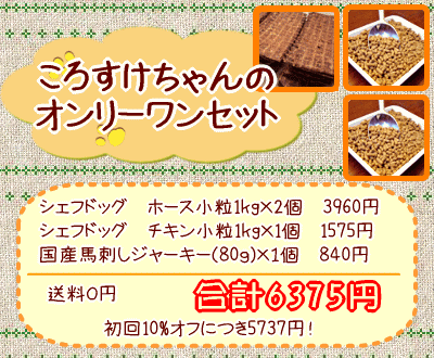 ころすけちゃんのオンリーワンセット定期購入価格: 6,375円レビュー評価: 0.0 レビュー数:0 ■シェフドッグ ホース小粒1kg×2個 3960円■シェフドッグ チキン小粒1kg×1個 1575円■国産馬刺しジャーキー(80g)×1個 840円-------------------------------------------送料0円合計6375円★初回10%オフにつき、5737円 |