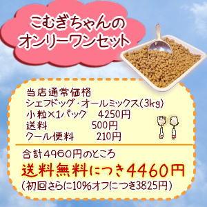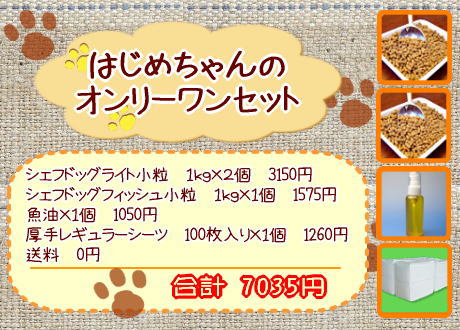 はじめちゃんのオンリーワンセット 定期購入価格: 7,035円レビュー評価: 0.0 レビュー数:0 ■シェフドッグライト小粒 1kg×2個 3150円■シェフドッグフィッシュ小粒 1kg×1個 1575円■魚油 1個 1050円厚手レギュラーシーツ 100枚入り 1個 1260円------------------------------------------------合計7035円(送料・代引き手数料無料) |
