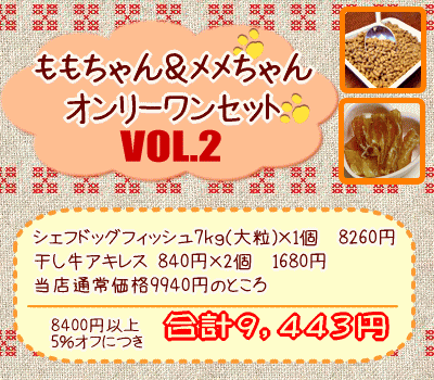 ももちゃん&メメちゃんオンリーワンセット vol.2 【定期購入】価格: 9,443円レビュー評価: 0.0 レビュー数:0 -------------------------------------------■シェフドッグ フィッシュ7kg(大粒)8260円■プライムケイズ国産牛 干し牛アキレス 840円×2個 1680円合計当店通常価格 9940円のところ、★8400円以上5%オフにつき9443円★------------------------------------------- |