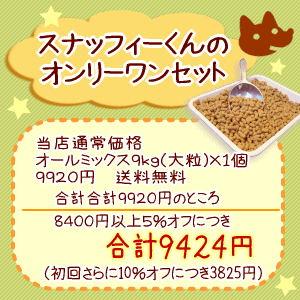 スナッフィーくんのオンリーワンセット 定期購入価格: 9,424円レビュー評価: 0.0 レビュー数:0 ■シェフドッグオールミックス9kg(大粒)×1個 9920円送料 0円------------------------------------------------合計9920円のところ、8400円以上5%オフにつき9524円!(さらに初回10%オフにつき8151円) |