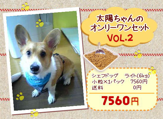 太陽ちゃんのオンリーワンセット vol.2 定期購入価格: 7,560円レビュー評価: 0.0 レビュー数:0 ■シェフドッグ ライト6kg(小粒)×1個 7560円送料 0円------------------------------------------------合計4250円 |
