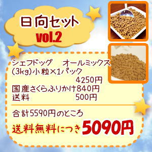 日向セット【オンリーワン】定期購入 vol.2価格: 5,090円レビュー評価: 0.0 レビュー数:0 ■シェフドッグ オールミックス3kg(小粒)×1個 4250円■国産さくらふりかけ×1個送料 0円------------------------------------------------合計5090円(初回10%オフにつき4581円) |