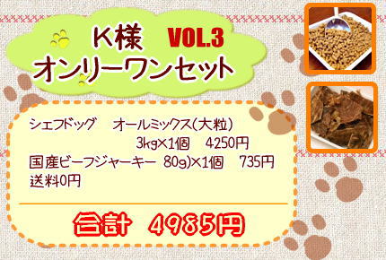 K様オンリーワンセット 定期購入 vol.3価格: 4,985円レビュー評価: 0.0 レビュー数:0 ■オールミックス大粒3kg×1個 4,250円■国産ビーフジャーキー(80g)×1個 735円-------------------------------------------------送料0円合計4985円 |