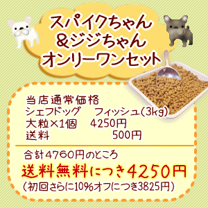 スパイクちゃん&ジジちゃんオンリーワンセット 定期購入価格: 4,250円レビュー評価: 5.0 レビュー数:1 シェフドッグ フィッシュ 3kg(大粒)×1個 4250円送料 0円夏季のクール便料金も無料です!----------------------------------------------合計4250円(初回10%オフにつき3825円) |