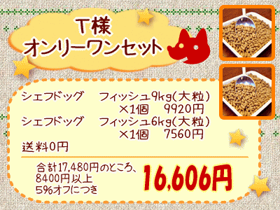 T様オンリーワンセット 定期購入 vol.2価格: 16,606円レビュー評価: 0.0 レビュー数:0 ■シェフドッグ フィッシュ9kg(大粒)×1個 9920円■シェフドッグ フィッシュ6kg(大粒)×1個 7560円送料0円------------------------------------------------合計17,480円のところ、8400円以上5%オフにつき16,606円! |